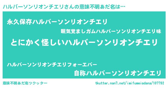 | 男性向けラノベタイトル風あだ名 | 『ハルバーソンリオンチエリの嫁は女の子じゃないと思った?』 |
