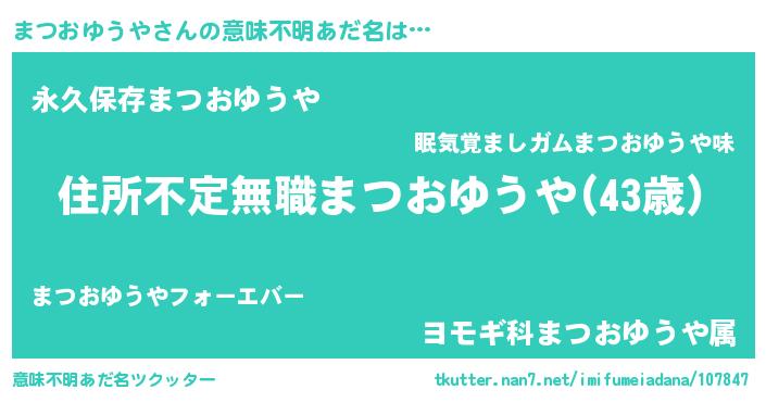 | 男性向けラノベタイトル風あだ名 | 『この素晴らしい世界にまつおゆうやを!』 |
