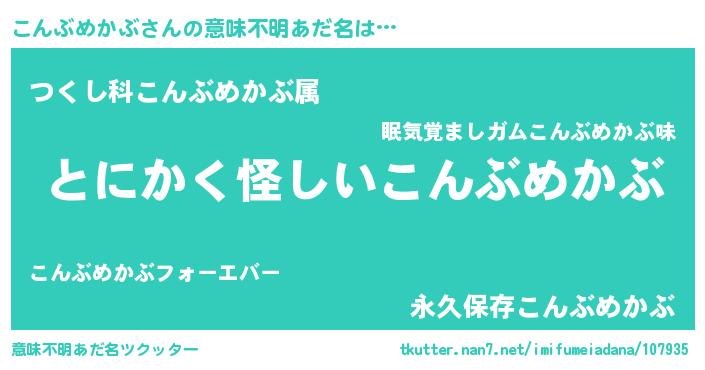 | 女子向けラノベタイトル風あだ名 | 『こんぶめかぶ様がみてる』 |