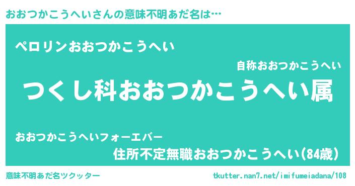 | 男性向けラノベタイトル風あだ名 | 『おおつかこうへい~年齢イコール彼女いない歴の魔法使い~』 |