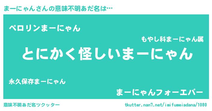 | 胡散臭い通販商品みたいなあだ名 | 『信頼と実績のサプリメント…その名も「まーにゃん」』 |