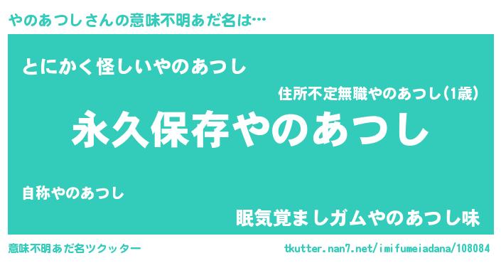 | 男性向けラノベタイトル風あだ名 | 『やのあつしという概念が存在しない退屈な世界 』 |