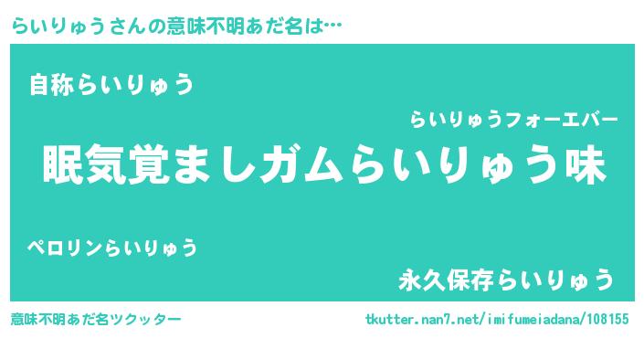 | 男性向けラノベタイトル風あだ名 | 『おまえをオタクにしてやるから、俺をらいりゅうにしてくれ! 』 |