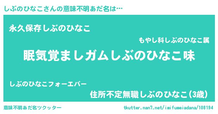 | 男性向けラノベタイトル風あだ名 | 『おまえをオタクにしてやるから、俺をしぶのひなこにしてくれ! 』 |