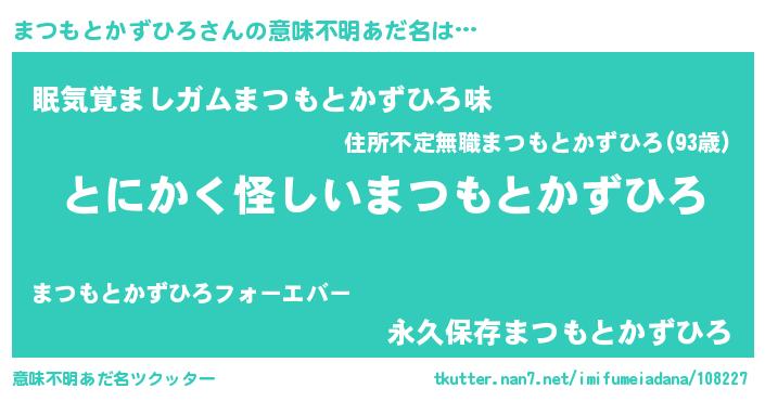 | 男性向けラノベタイトル風あだ名 | 『ダンジョンにまつもとかずひろを求めるのは間違っているだろうか』 |