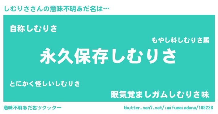| 女子向けラノベタイトル風あだ名 | 『異世界で失敗しない100のしむりさ』 |