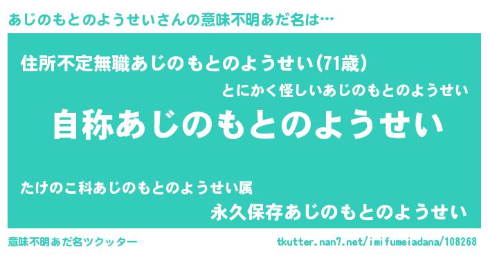 | 男性向けラノベタイトル風あだ名 | 『Re:あじのもとのようせいから始める異世界生活』 |