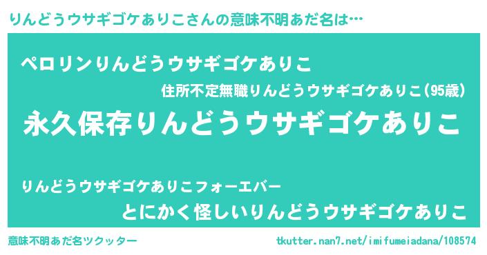 | 女子向けラノベタイトル風あだ名 | 『異世界で失敗しない100のりんどうウサギゴケありこ』 |