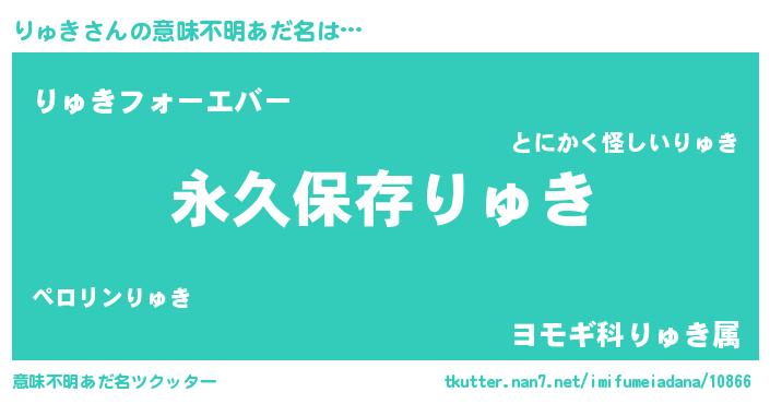 | 男性向けラノベタイトル風あだ名 | 『りゅきという概念が存在しない退屈な世界 』 |