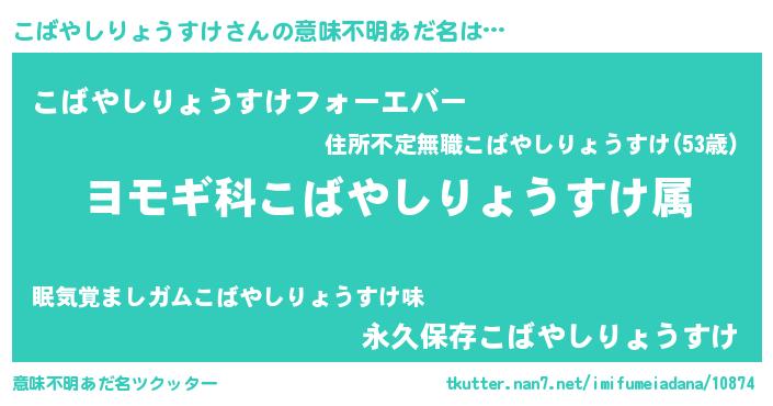 | 男性向けラノベタイトル風あだ名 | 『こばやしりょうすけ~年齢イコール彼女いない歴の魔法使い~』 |