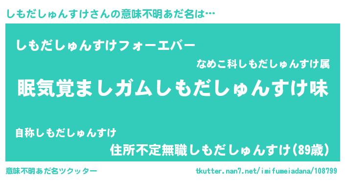| 男性向けラノベタイトル風あだ名 | 『おまえをオタクにしてやるから、俺をしもだしゅんすけにしてくれ! 』 |