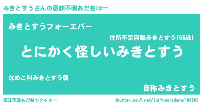 | 男性向けラノベタイトル風あだ名 | 『みきとすうの嫁は女の子じゃないと思った?』 |
