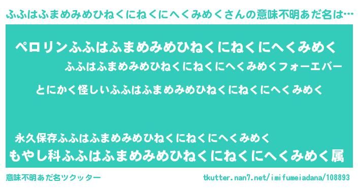 | 萌えアニメ | 主人公(ふふはふまめみめひねくにねくにへくみめく)のあだ名『ふふはふまめみめひねくにねくにへくみめくにゃん』 |