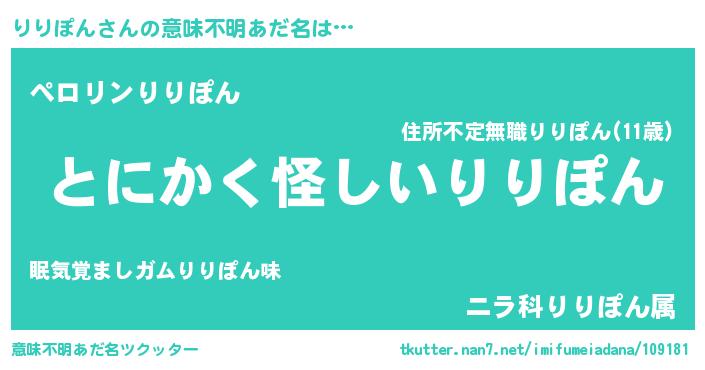 | 男性向けラノベタイトル風あだ名 | 『ダンジョンにりりぽんを求めるのは間違っているだろうか』 |