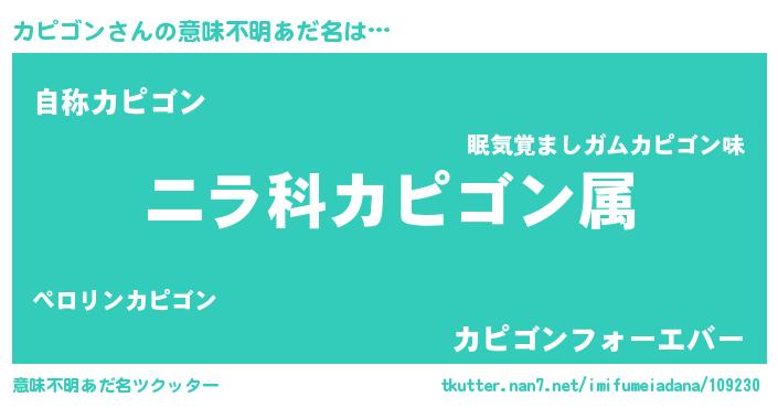 | 男性向けラノベタイトル風あだ名 | 『カピゴン~年齢イコール彼女いない歴の魔法使い~』 |