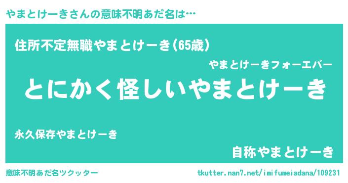 | 男性向けラノベタイトル風あだ名 | 『やまとけーきに滅ぼされるだけの簡単なお仕事です』 |
