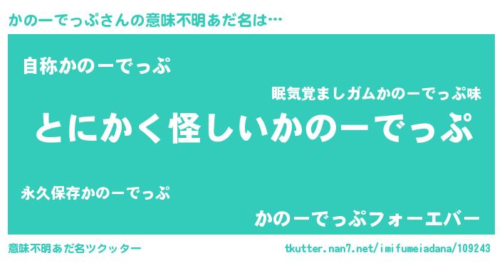 | 女子向けラノベタイトル風あだ名 | 『かのーでっぷの卵を拾いまして』 |