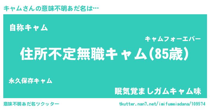 | 男性向けラノベタイトル風あだ名 | 『魔弾の王とキャム』 |