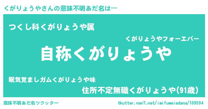 | 男性向けラノベタイトル風あだ名 | 『くがりょうやに滅ぼされるだけの簡単なお仕事です』 |