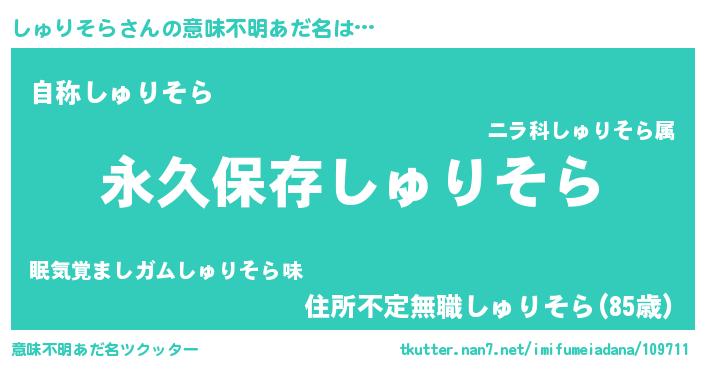 | ヘコむあだ名 | 『しゅりそら(遠い目)』『しゅっぺ』 |