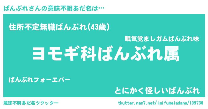 | 男性向けラノベタイトル風あだ名 | 『ばんぶれ~年齢イコール彼女いない歴の魔法使い~』 |