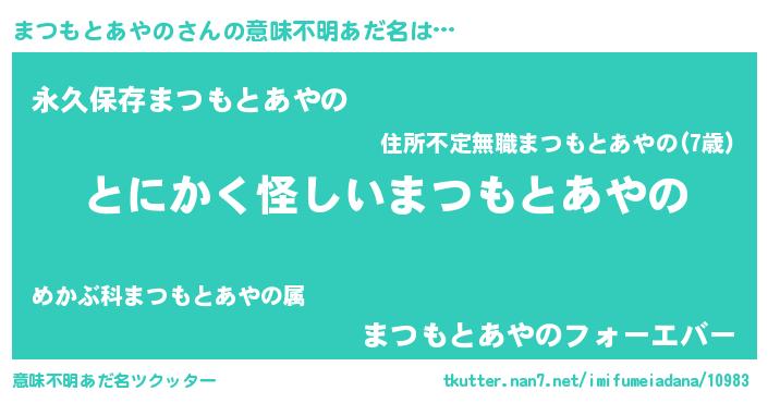 | 胡散臭い通販商品みたいなあだ名 | 『信頼と実績のサプリメント…その名も「まつもとあやの」』 |