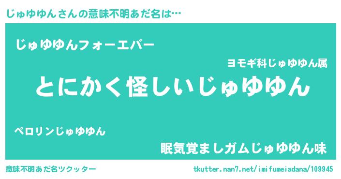 | 男性向けラノベタイトル風あだ名 | 『じゅゆゆんに滅ぼされるだけの簡単なお仕事です』 |