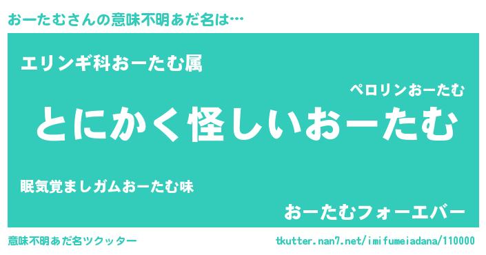 | 男性向けラノベタイトル風あだ名 | 『おーたむの嫁は女の子じゃないと思った?』 |