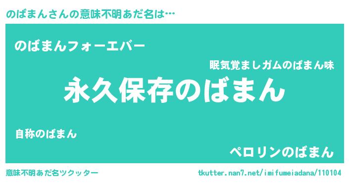 | 男性向けラノベタイトル風あだ名 | 『のばまんという概念が存在しない退屈な世界 』 |