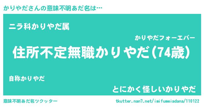 | 男性向けラノベタイトル風あだ名 | 『この素晴らしい世界にかりやだを!』 |