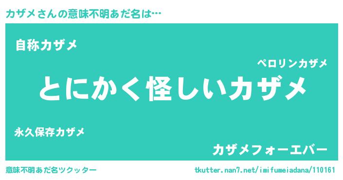 | 女子向けラノベタイトル風あだ名 | 『カザメ様がみてる』『カザメ伯爵の花嫁』 |