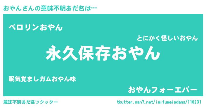 | 胡散臭い通販商品みたいなあだ名 | 『来世でも幸せになれる水素水…その名も「おやん」』 |