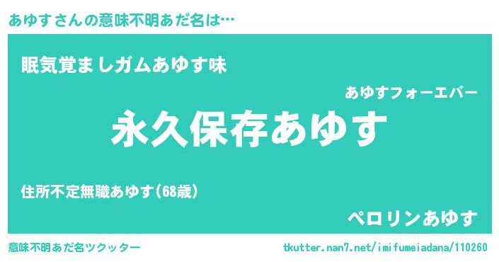| ヒーロー風カッコイイあだ名 | 『ネオアユス』『愛の使者あゆす』 |