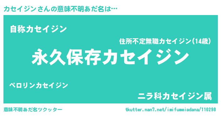 | 胡散臭い通販商品みたいなあだ名 | 『絶対に幸福をもたらす健康食品…その名も「カセイジン」』 |