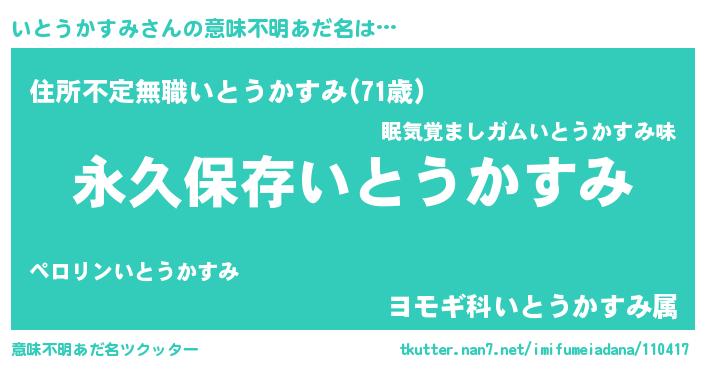 | 胡散臭い通販商品みたいなあだ名 | 『絶対に幸福をもたらす健康食品…その名も「いとうかすみ」』 |