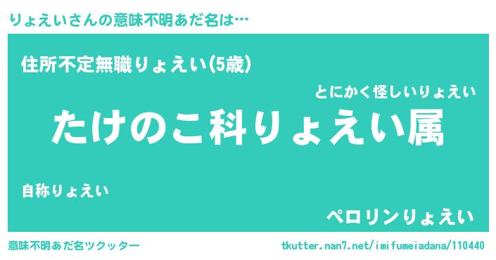 | 男性向けラノベタイトル風あだ名 | 『転生したらりょえいだった件』 |