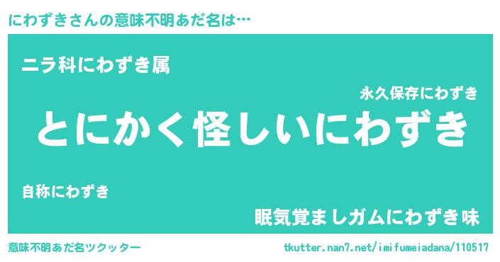 | 男性向けラノベタイトル風あだ名 | 『にわずきの嫁は女の子じゃないと思った?』 |