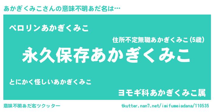 | 胡散臭い通販商品みたいなあだ名 | 『来世でも幸せになれる水素水…その名も「あかぎくみこ」』 |