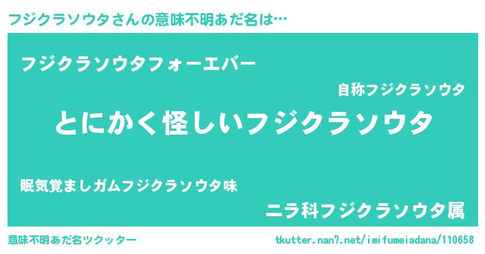 | 胡散臭い通販商品みたいなあだ名 | 『信頼と実績のサプリメント…その名も「フジクラソウタ」』 |