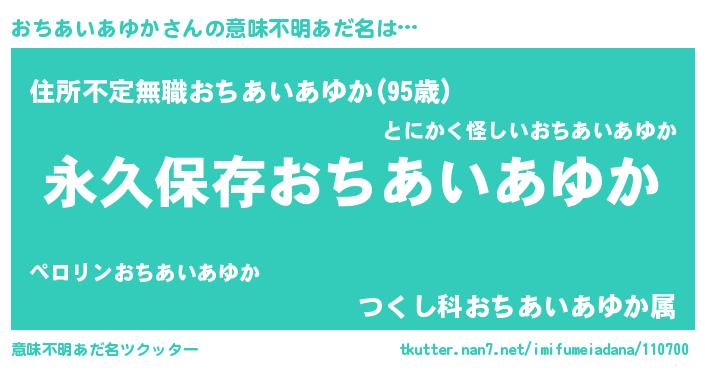 | 男性向けラノベタイトル風あだ名 | 『おちあいあゆかという概念が存在しない退屈な世界 』 |