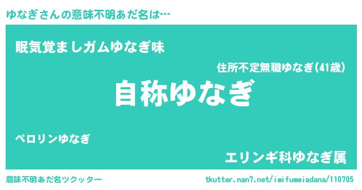 | 男性向けラノベタイトル風あだ名 | 『Re:ゆなぎから始める異世界生活』 |