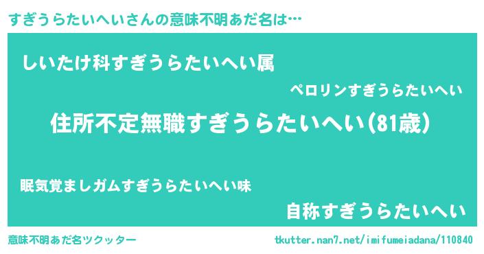 | 男性向けラノベタイトル風あだ名 | 『魔弾の王とすぎうらたいへい』 |