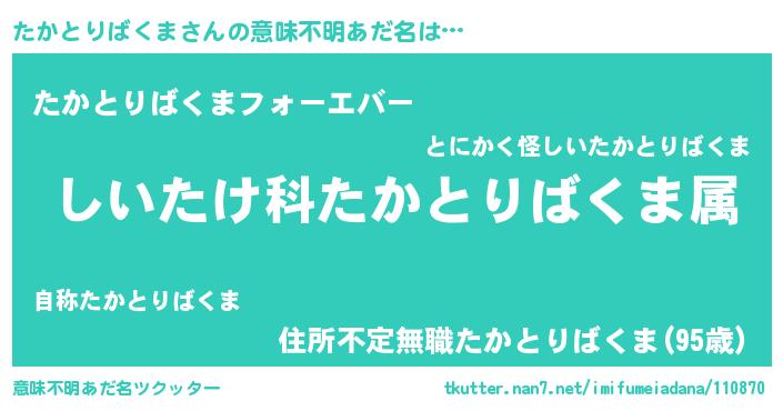 | 男性向けラノベタイトル風あだ名 | 『はたらくたかとりばくまさま!』 |