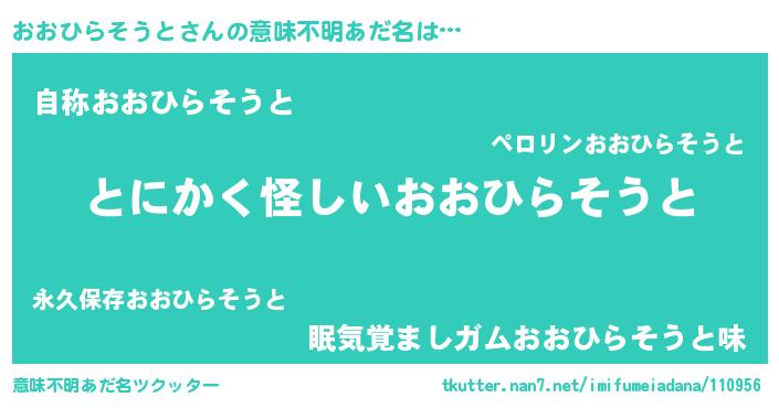 | 男性向けラノベタイトル風あだ名 | 『おおひらそうとの嫁は女の子じゃないと思った?』 |