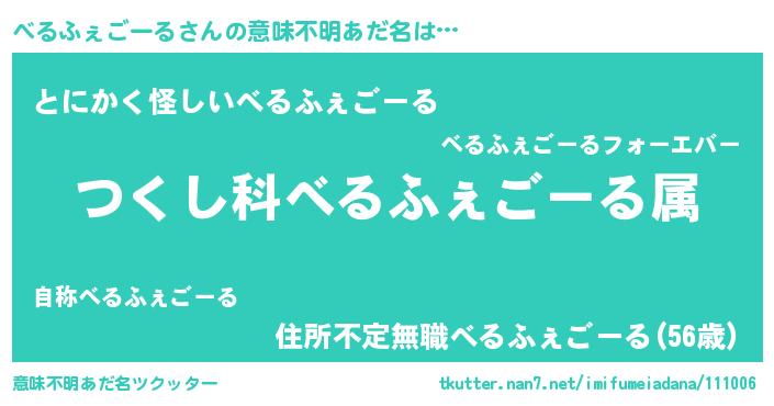 | 男性向けラノベタイトル風あだ名 | 『べるふぇごーる~年齢イコール彼女いない歴の魔法使い~』 |
