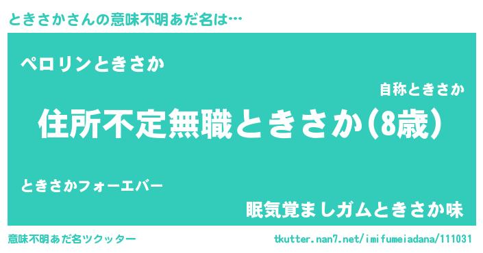 | 男性向けラノベタイトル風あだ名 | 『魔弾の王とときさか』『ときさかの憂鬱』 |