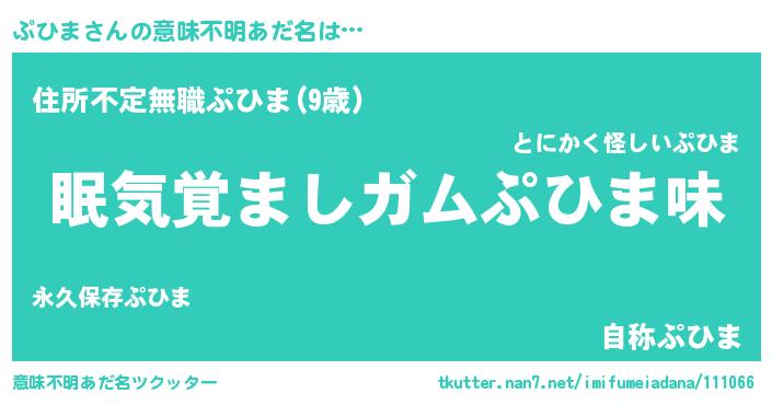 | 女子向けラノベタイトル風あだ名 | 『ぷひま夫妻のなれそめ』『闇のぷひま』 |