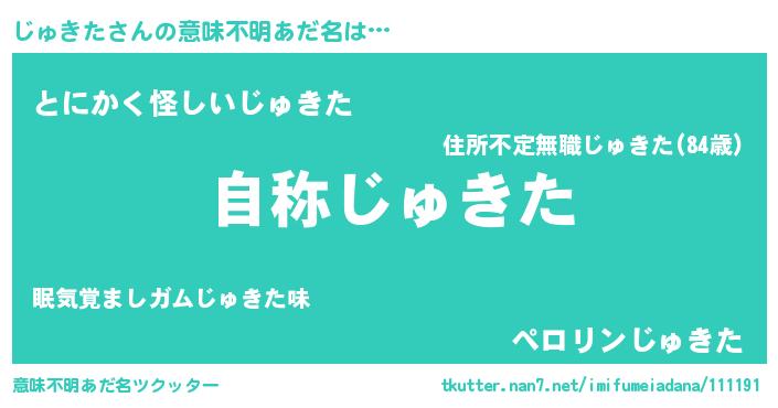 | 男性向けラノベタイトル風あだ名 | 『じゅきたに滅ぼされるだけの簡単なお仕事です』 |