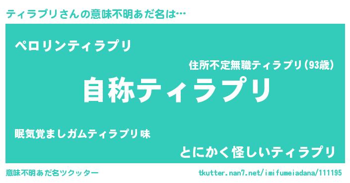 | 女子向けラノベタイトル風あだ名 | 『ティラプリなんてお断りですっ。』 |