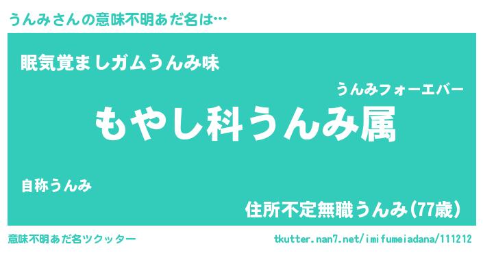 | 男性向けラノベタイトル風あだ名 | 『転生したらうんみだった件』 |